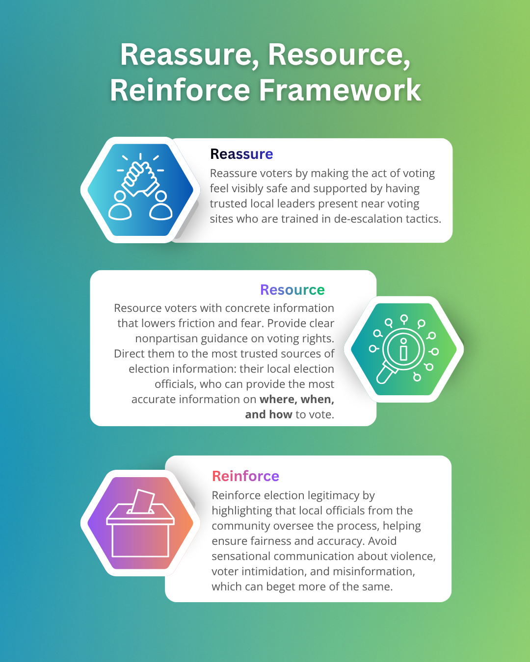 Reassure voters by making the act of voting feel visibly safe and supported by having trusted local leaders present near voting sites, who are trained in de-escalation tactics.